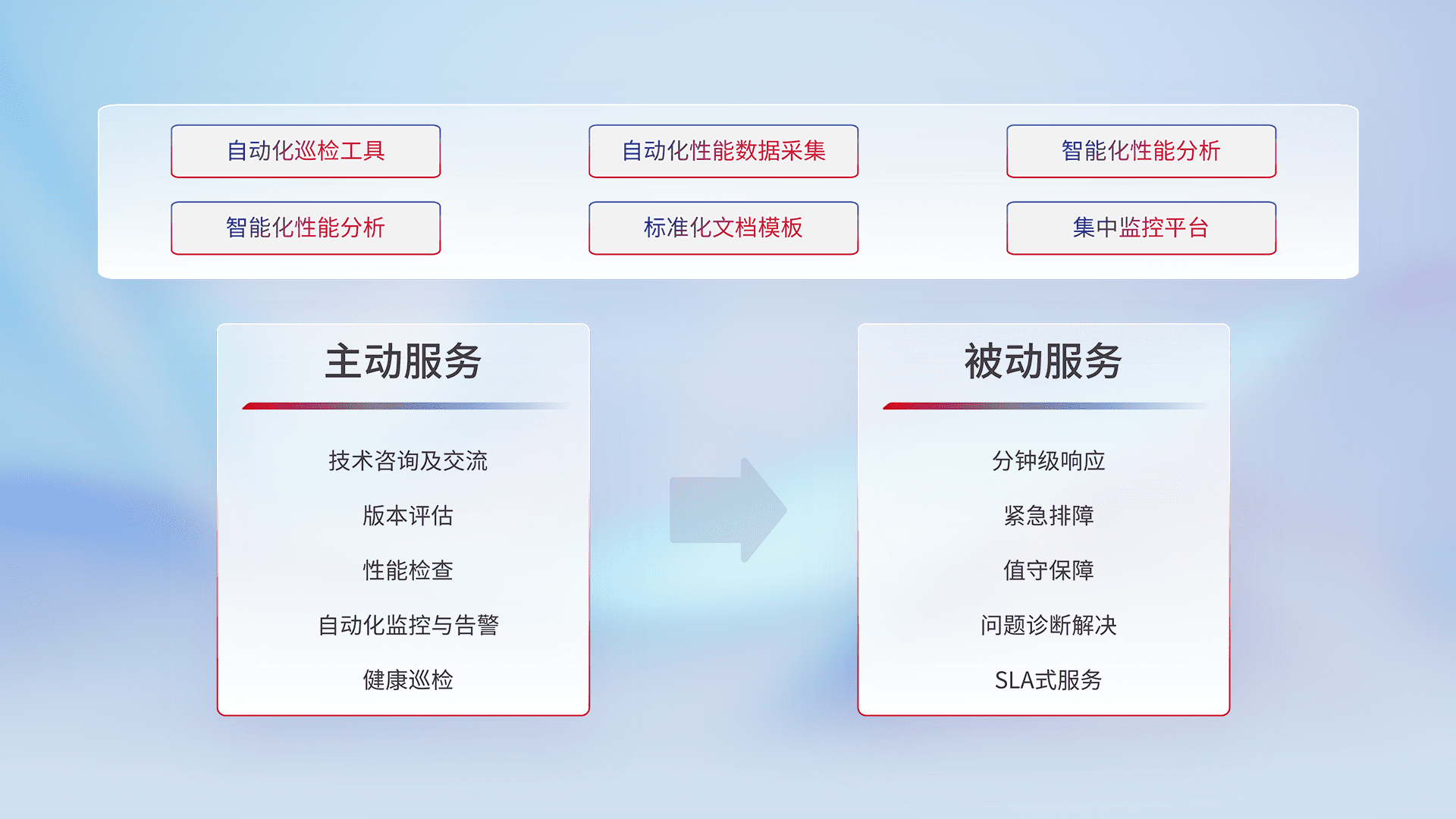 智能化工具和标准化文档,,,保障服务质量,,提供主动服务(包含技术咨询、、版本评估、、、、性能检查、、、、自动化监控与告警、、健康巡检)和被动服务包含(分钟级响应、、、紧急排障、、、值守保障、、、、问题诊断解决、、SLA服务)。。